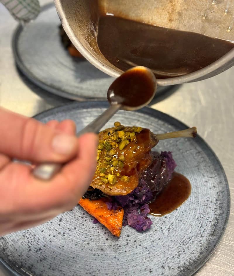 • Roast Leg Of Preseli Lamb, Sweet Potato, Rosemary & Miso Mash, Raisin Jus